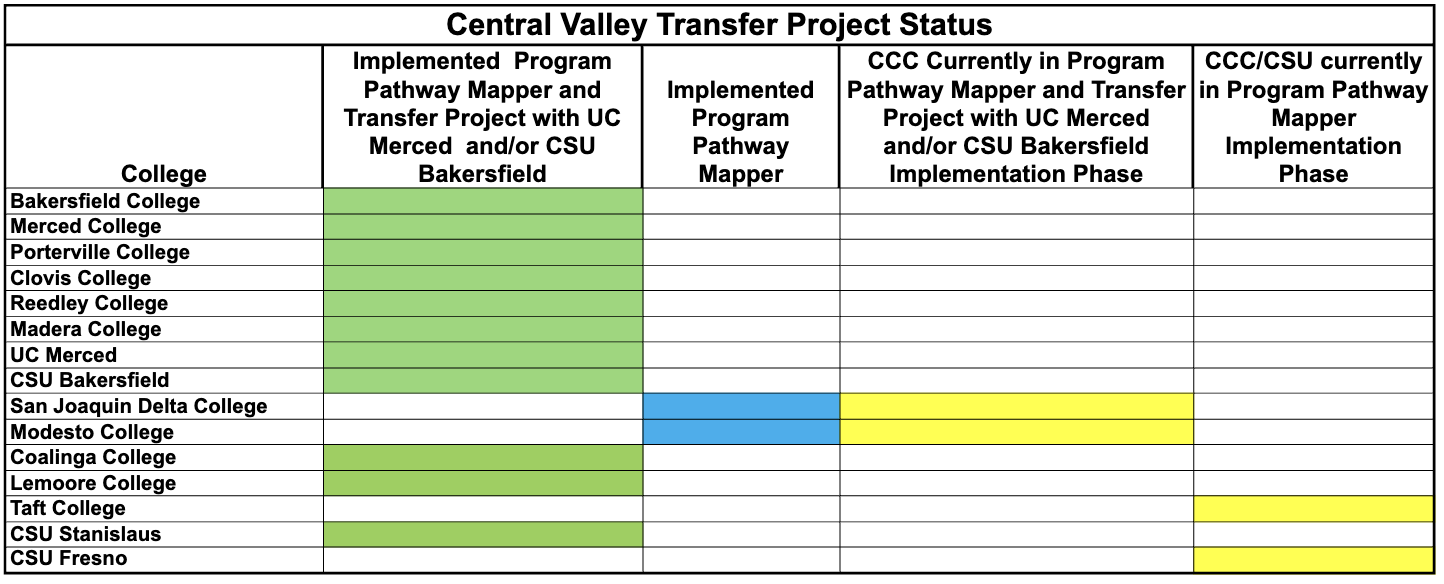 In 2018 UC Merced met with CVHEC expressing grave concern for the low number of Central Valley CC transfers. The next year a pilot project was launched with Merced College (MC) and Bakersfield College (BC) to explore new strategies to increase transfers. At the same time, CSU Bakersfield was collaborating with Bakersfield College to create full transfer pathways aligned with the CSU-approved ADTs. A third element, the Pathways Program Mapper emerged which is a public internet-based software application that presents students with pre-approved course sequences aligning the CC ADTs with the upper division requirements by major, for successful degree completion.