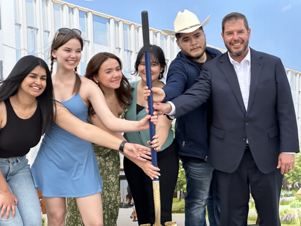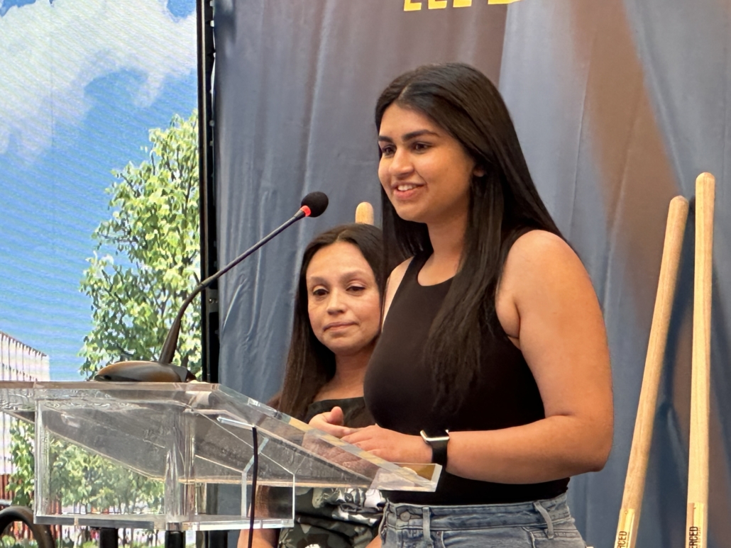 UC Merced Chancellor Juan Sánchez Muñoz introduces alumna Dr. Maricela Rangel-Garcia and student Sanmeet Deol at the historic UCM Medical Education Building groundbreaking May 14.