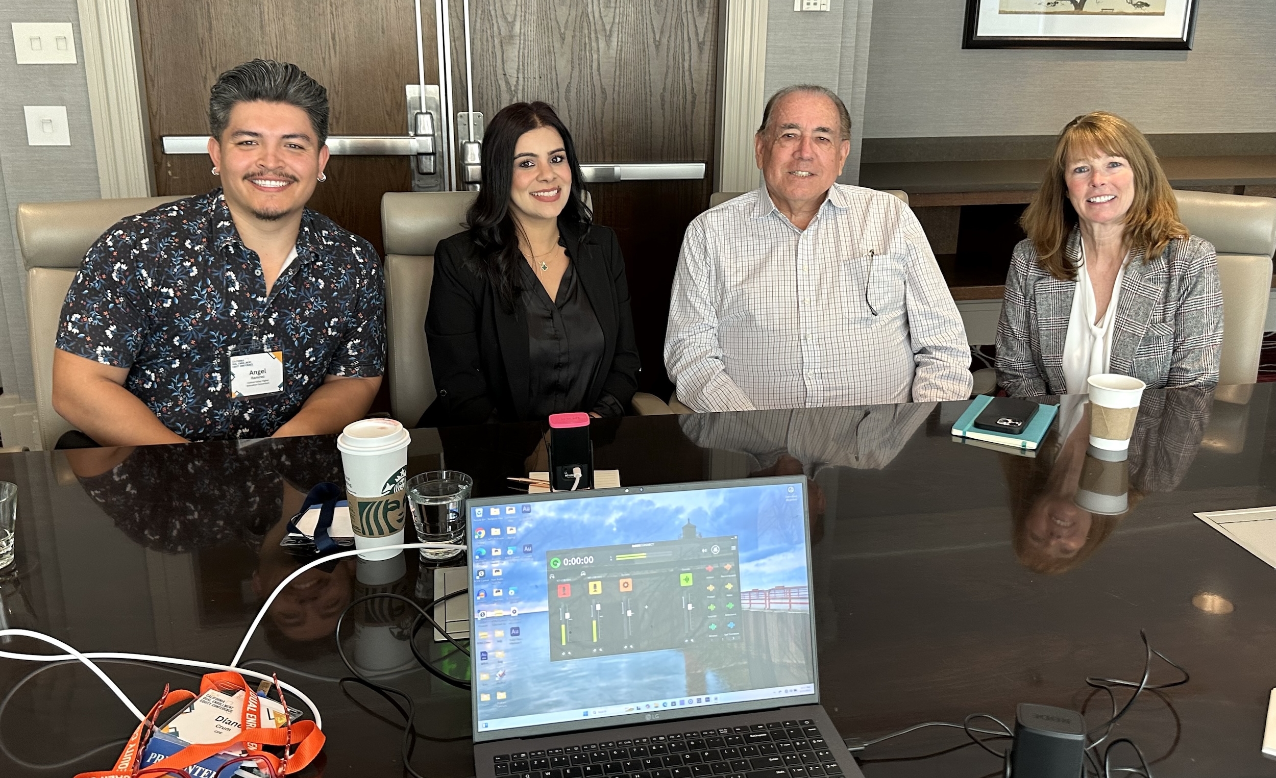 Interviewed and sharing our dual enrollment initiatives during a California Department of Education podcast at the third annual statewide conference held Feb. 23-26 in Sacramento were Ángel Ramírez, CVHEC Operations & Finance manager; Ginny Sandhu, Sunnyside High School (Fresno Unifed) English teacher who earned qualification to teach dual enrollment courses through CVHEC’s Master’s Upskilling Program; and Dr. Benjamín Durán, CVHEC executive director; here with podcast host Diane Crum, Education Programs consultant in the the California Department of Education’s High School Innovations and Initiatives Office.