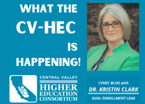 This edition of the “What the CV-HEC is Happening” Blog features Dr. Kristin Clark, chancellor-emeritus of the West Hills Community College District, who in March came out of short-lived retirement to join the CVHEC team as dual enrollment lead, announced in our March issue by Dr. Benjamín Durán, CVHEC executive director. Here Dr. Clark provides some insight into this bold move to throw down the retirement mantle and resume her “commitment to higher education, particularly in support of those who have been marginalized and underserved.” For more information about partnering with CVHEC’s dual enrollment team, contact us at CVHECinfo@mail.fresnostate.edu. (CVHEC blog submissions are welcome for consideration: Tom Uribes, cvheccommunications@mail.fresnostate.edu).