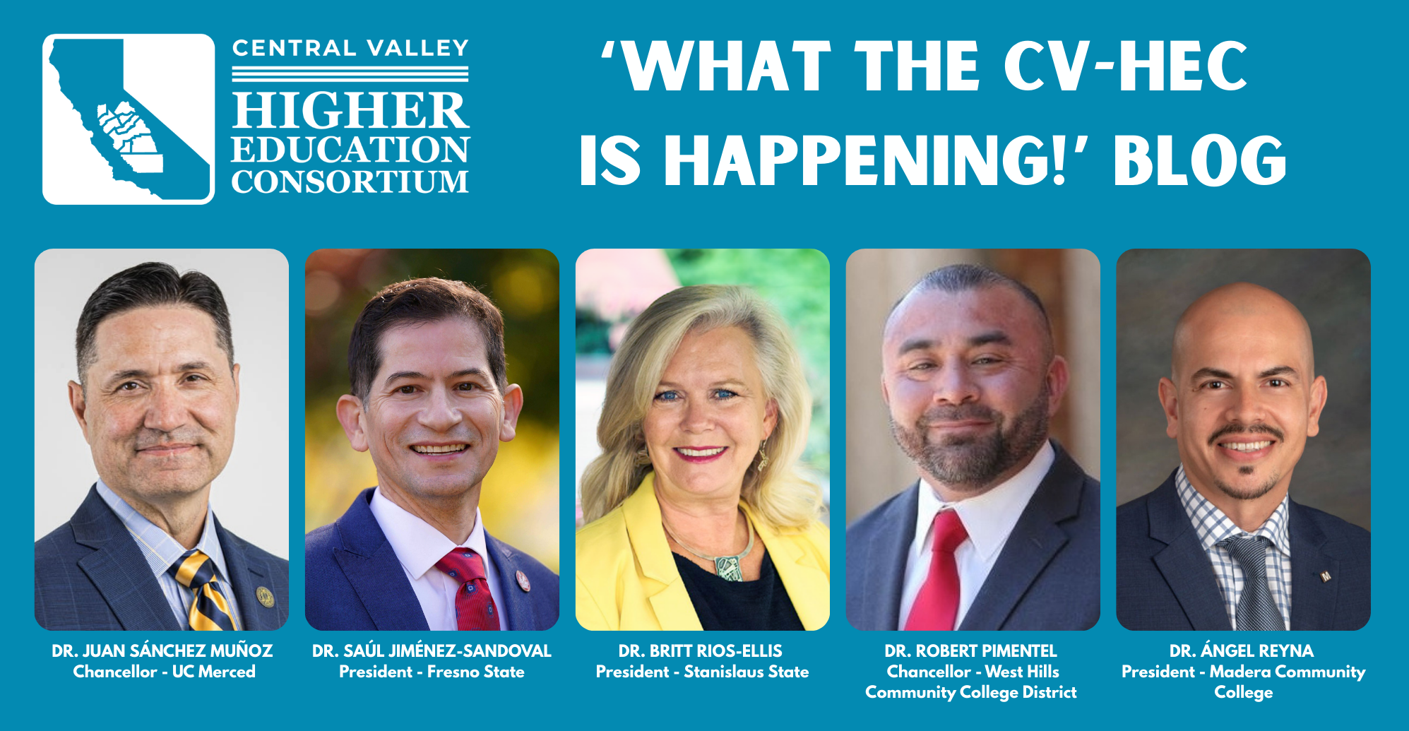 This month’s “What the CV-Hec is Happening” Blog features this op ed first published Nov. 13 in The Fresno Bee penned by five Central Valley Higher Education Consortium board members: Britt Rios-Ellis, M.S., Ph.D., president of California State University, Stanislaus; Robert Pimentel, Ed.D., chancellor of West Hills Community College District; Ángel Reyna, Ed.D., president of Madera Community College; Juan Sánchez Muñoz, Ph.D., chancellor of UC Merced; and Saúl Jiménez-Sandoval, Ph.D., president of California State University, Fresno. They articulate how a higher education provides a powerful and proven pathway for students and communities to rise. Beginning at a local community college and continuing at a public or private four-year institution, higher education unlocks the full potential of every region, every community and every young person — especially within the Central Valley. Reprinted here with minor updates. (We welcome feedback as well as ideas for future blog topics: Tom Uribes, cvheccommunications@mail.fresnostate.edu).